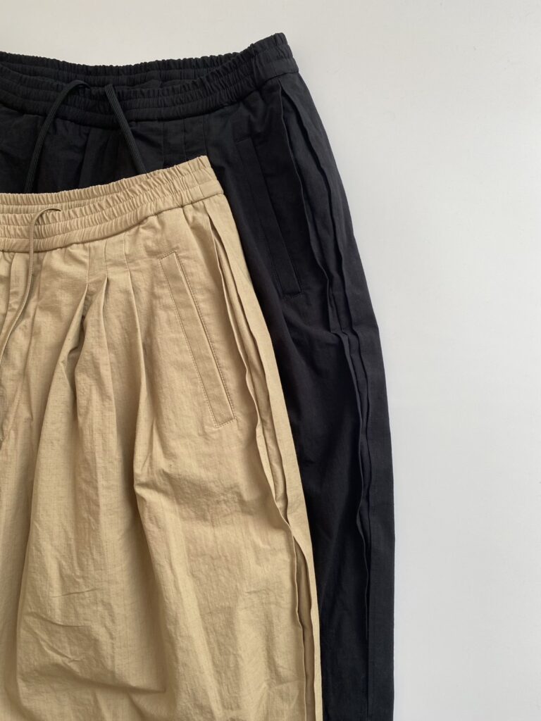 パンツは脇のプリーツをウエストと裾で留めていることから、着用時、バルーン状に