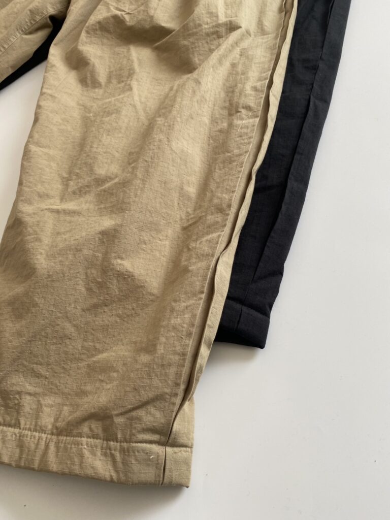 パンツの脇にプリーツを向かい合わせて作ることにより、マチを付けて可動域を拡げる