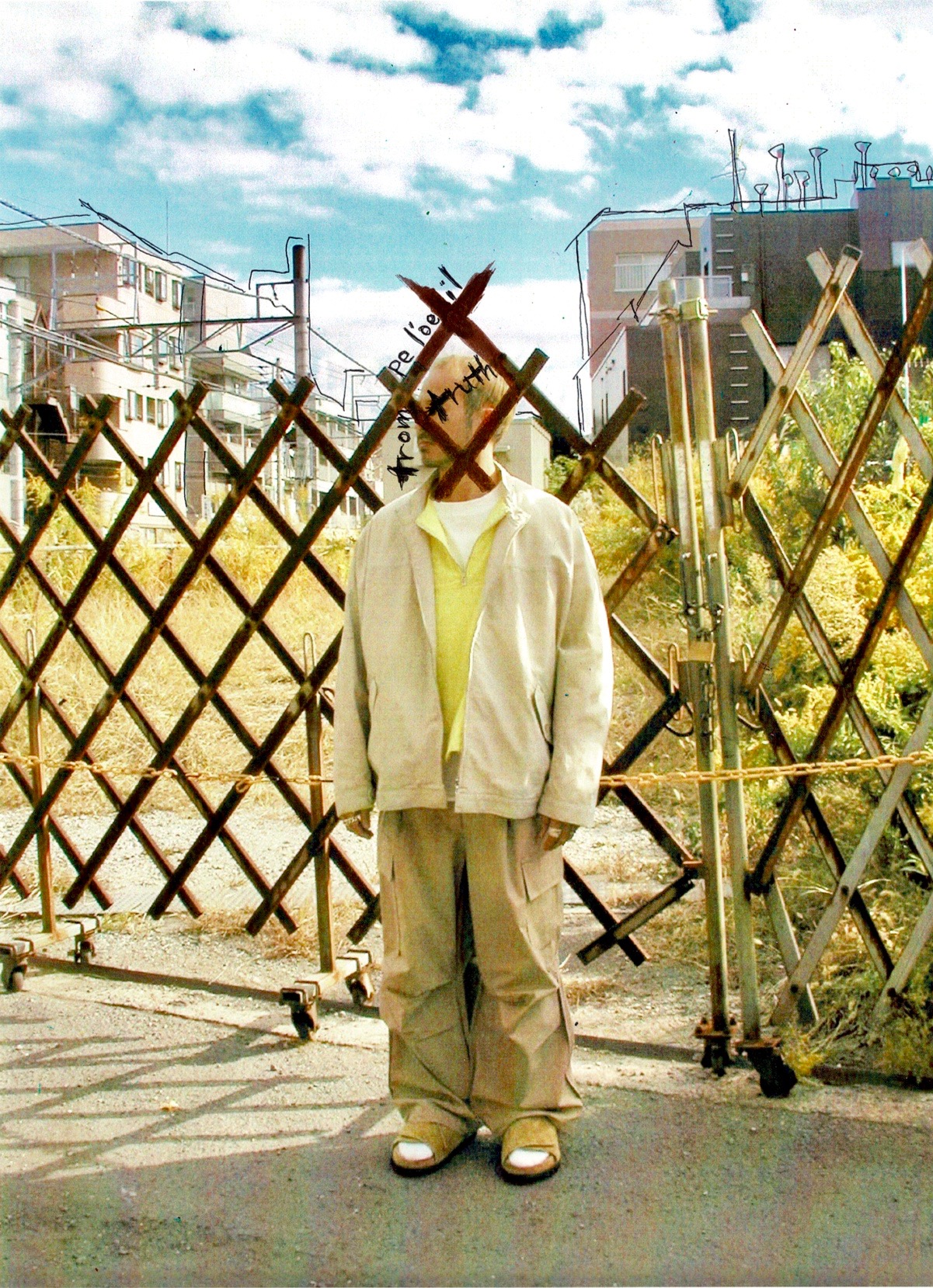 Wide Brim Straw Hat × L/S Open-Collar Wide Shirt × Cotton Tank Top × Denim Big Balloon Pants × Leather Sandals
