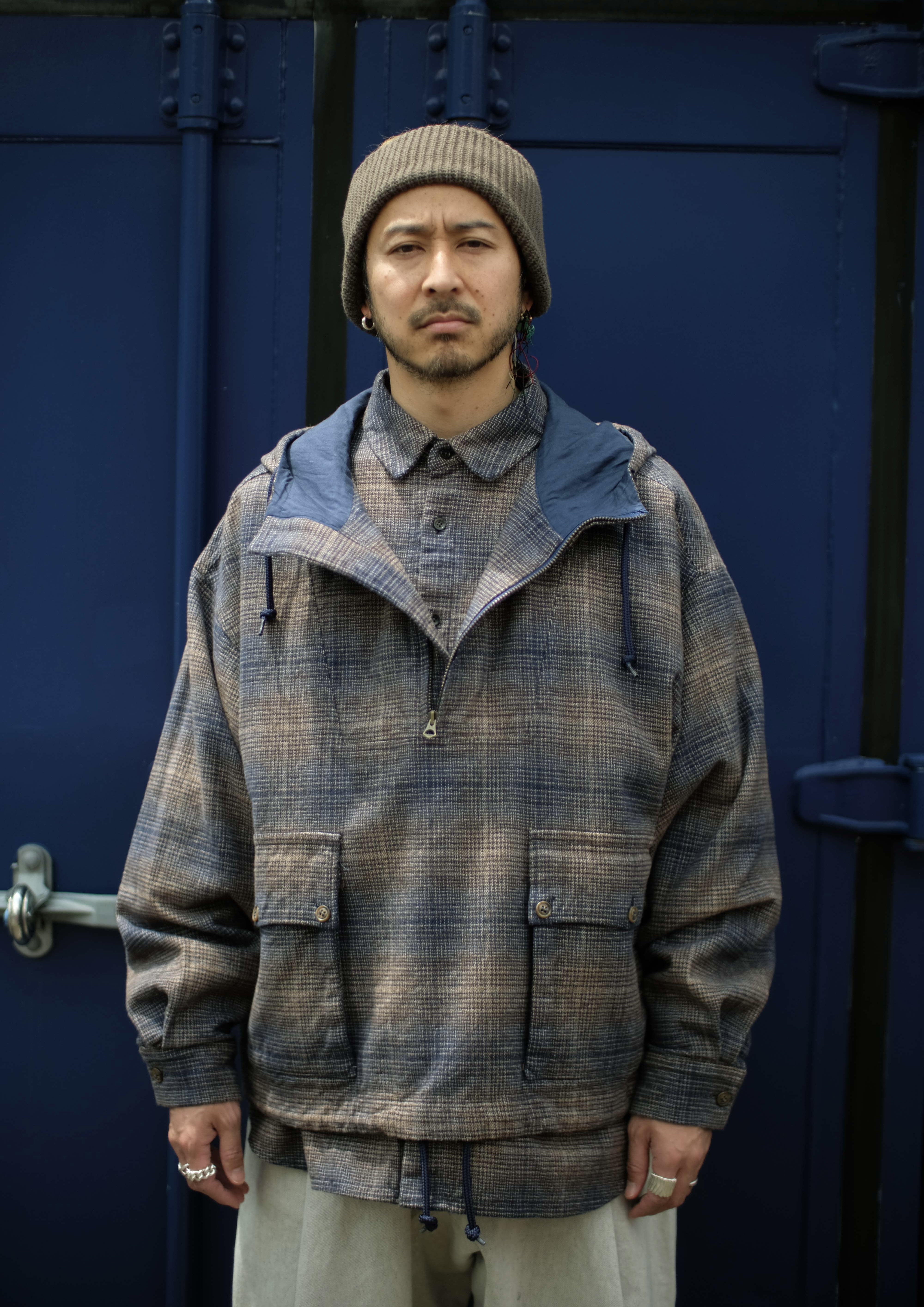 Wool Cap × Wool Convertible Collar Coat × L/S Indigo Shirt × Hand Dyeing 2tuck Pants
