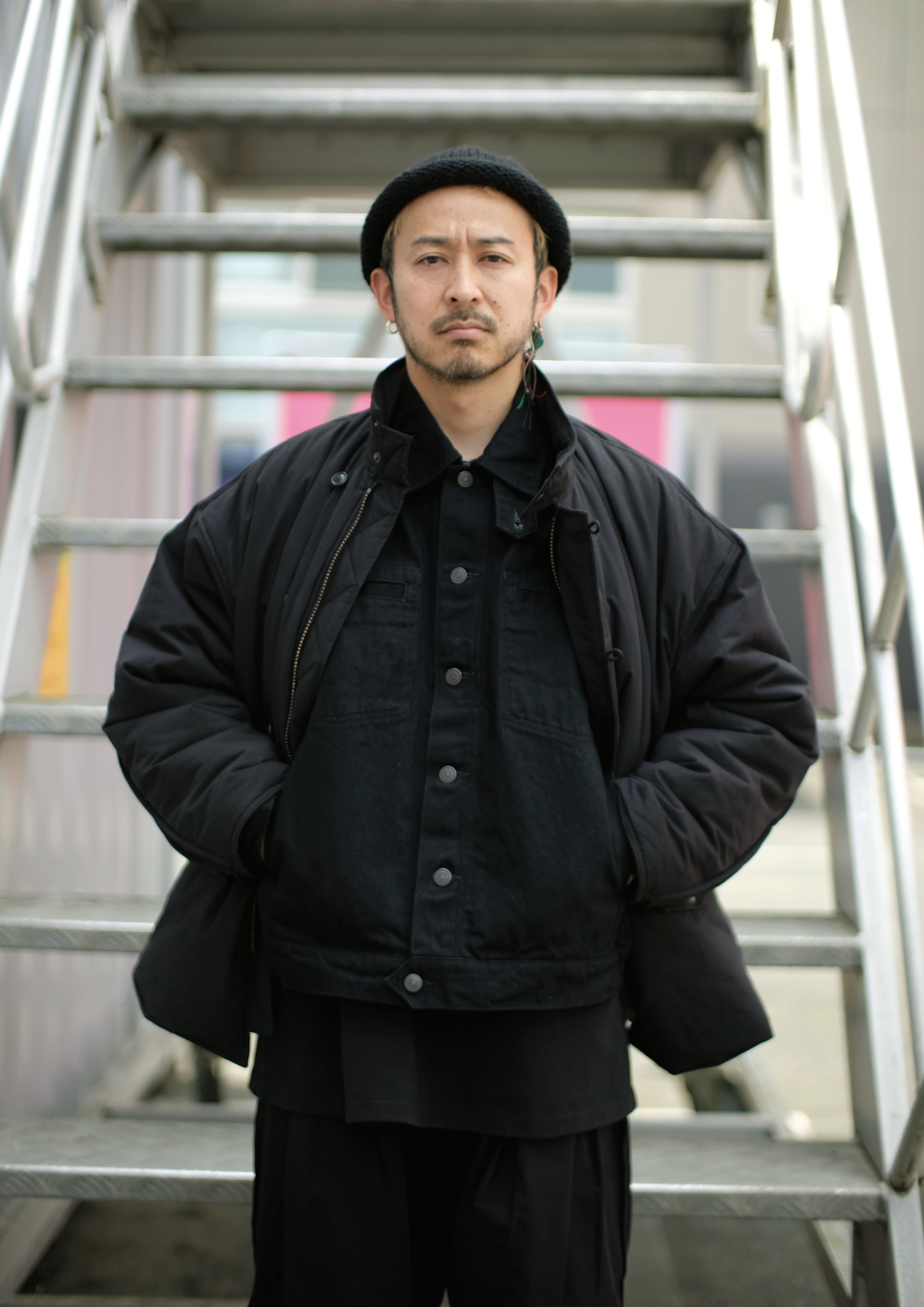 Leather Cap × Sashiko Hoodie × Sashiko Cropped Pants