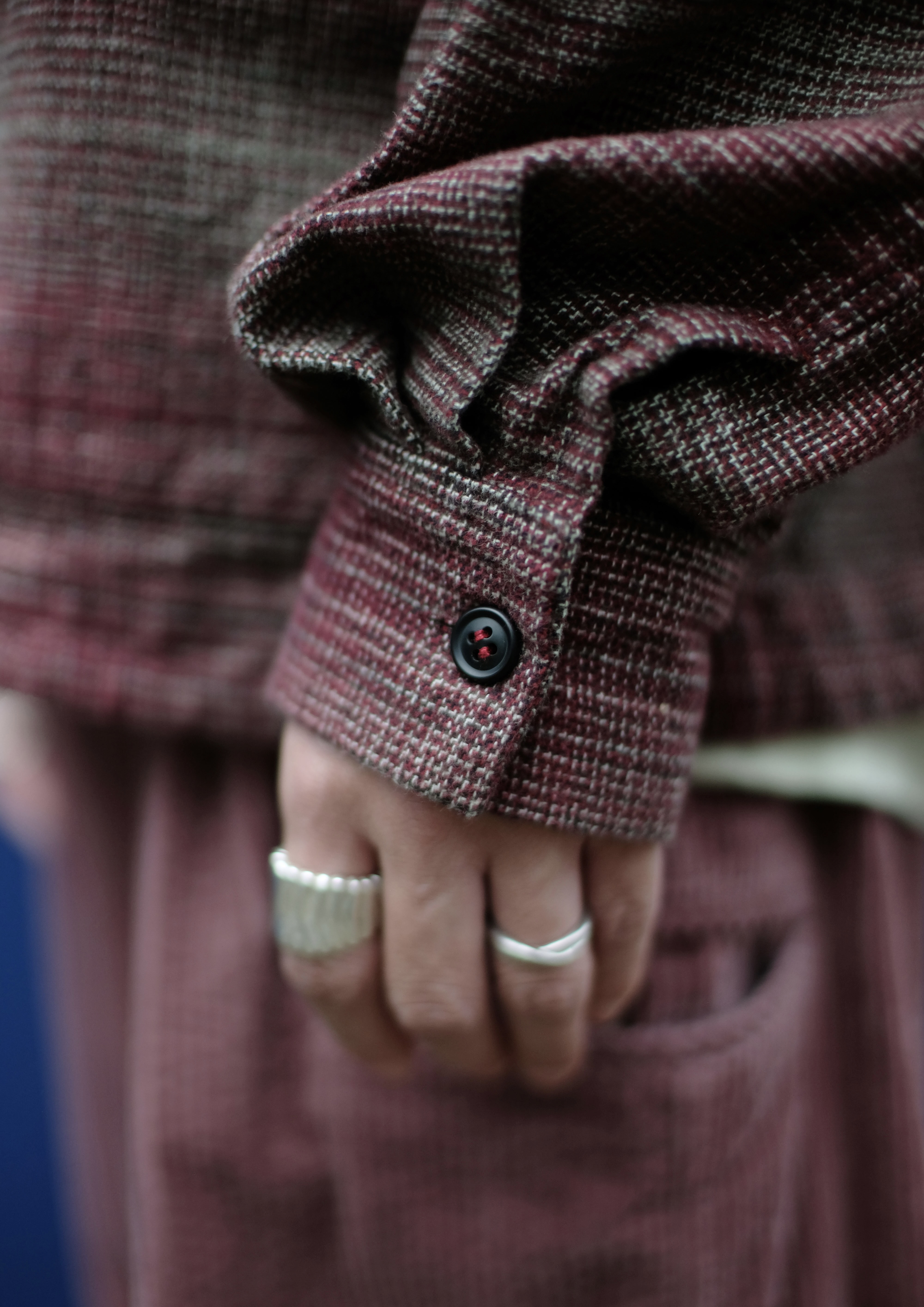Herringbone Big Beret・L/S Cotton Tweed Shirt・L/S Cup Shoulder T-Shirt・Corduroy Big Balloon Pants・Silver Cross-Over Ring